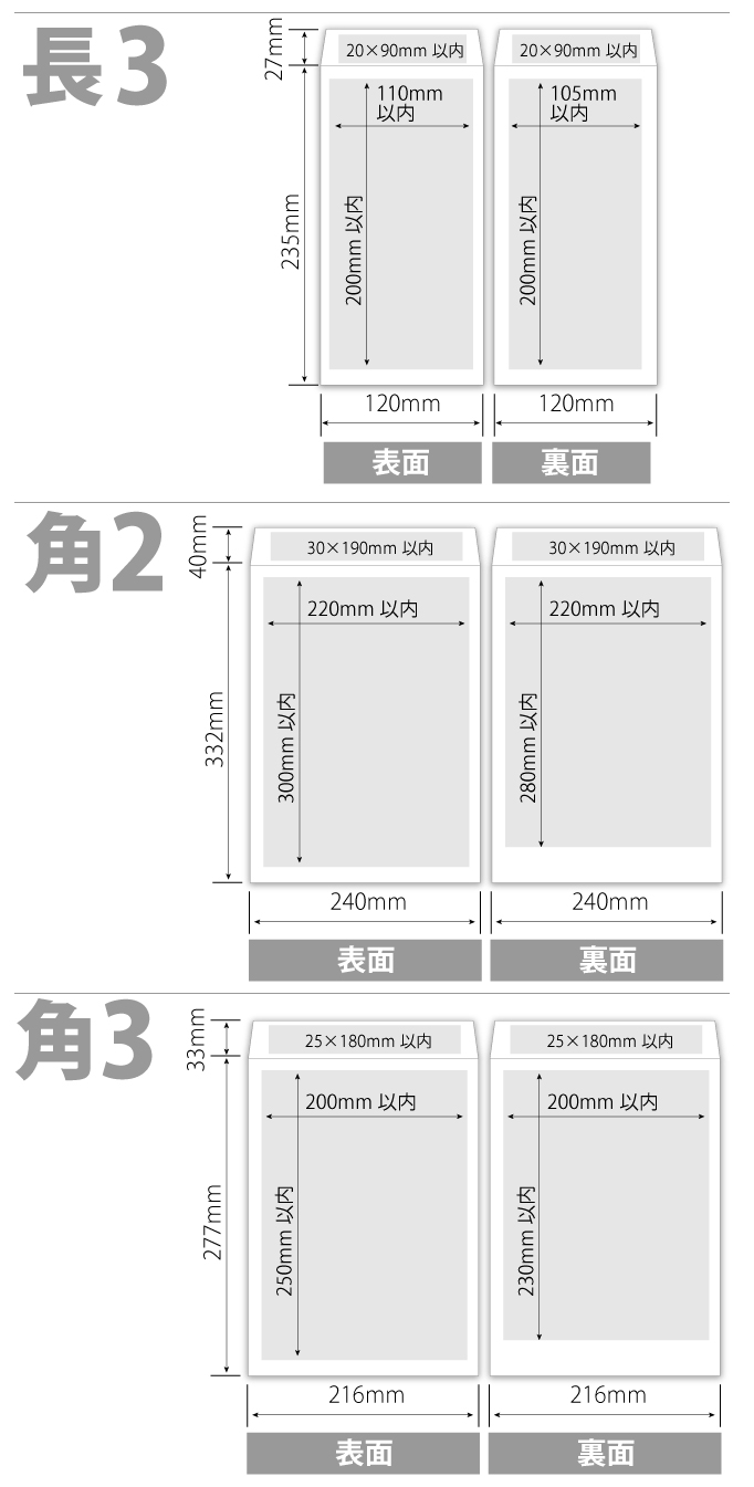 封筒は両面に印刷可能ですが、印刷できる範囲が決まっております。各封筒の印刷範囲をお確かめの上、データの作成をお願いいたします。